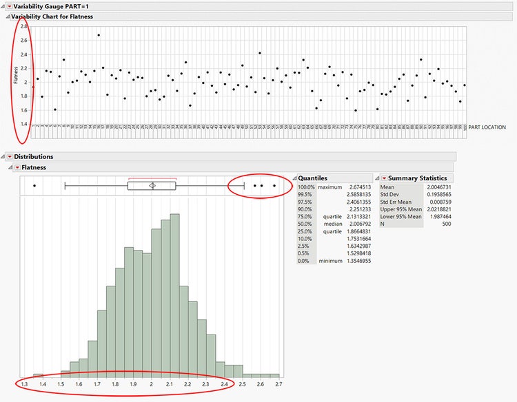 Grâce à ce flux de travail analytique unique, l'équipe a rapidement appris deux informations essentielles : d'une part, que toutes les pièces présentaient une distribution de planéité similaire et, d'autre part, qu'il existait des régions spécifiques - le bas gauche et le centre supérieur - où les valeurs de planéité étaient systématiquement plus élevées. Grâce à ces informations, l'équipe de M. Cianchini a pu identifier avec précision les endroits où la machine introduisait des variations. "C'est ainsi que nous sommes passés d'un problème non spécifié à une description détaillée et, en fin de compte, à la solution de notre problème.
