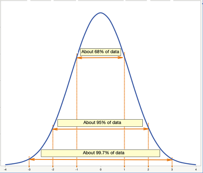 Dies ist leichter zu verstehen, wenn man sich das Diagramm einer Normalverteilung in Abbildung 1 anschaut. Die Mitte des Diagramms – Null auf der x-Achse – stellt den Mittelwert der Daten dar. Die orange gepunkteten vertikalen Linien werden bei einer, zwei und drei Standardabweichungen vom Mittelwert gezeichnet.