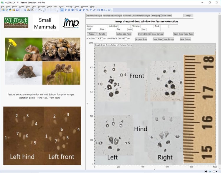 FIT is then able to place the photos in JMP’s feature extraction window and pick seven landmark points based on clarity and consistency. JMP then produces a data table of all the data points that have been collected, which allows JMP to run an analysis to match footprints to species based on previous data.