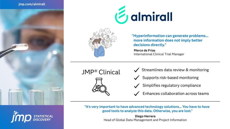 “We felt that JMP Clinical would provide Almirall the data management possibilities [we needed] without requiring additional data transformation from the CROs to deliver integrated patient data access to clinical teams efficiently not only during the study but also when exploring data retrospectively.”