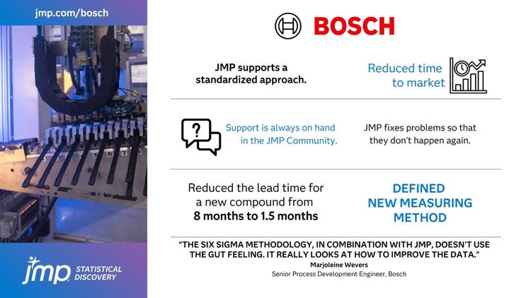 At Bosch Mobility Solutions, a data-driven approach powered by JMP has advanced Six Sigma methodologies to drive manufacturing efficiency. Custom design of experiments has transformed how teams optimize product development to ensure consistent quality with smart decision making while significantly reducing time to market.