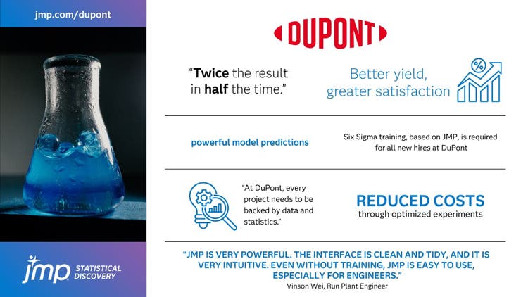 A compulsory in-house Six Sigma training program based on JMP® statistical discovery software has accelerated the rollout of advanced analytics at the enterprise level. Today, every DuPont engineer has the ability – and tools – to apply best practices in data analytics, achieving key performance indicators faster and more cost-efficiently.