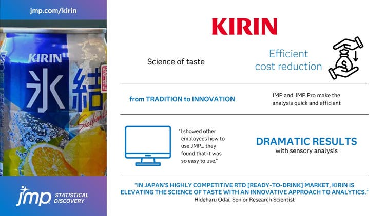 In the wake of Odai’s early successes, other researchers at Kirin also started using JMP. “I showed other employees how to use JMP, and then through that process, my colleagues started to understand the benefits that they can get out of JMP. That’s how we increased the number of users here at Kirin – they found that it was so easy to use.”