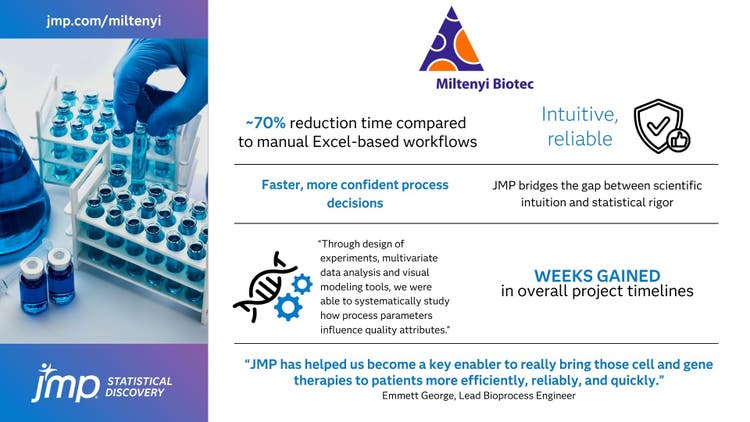 We use JMP specifically to empower the scientists and engineers at Miltenyi to use those statistical tools proactively instead of reactively, which strengthens our processes and helps us accelerate bringing those products to market.