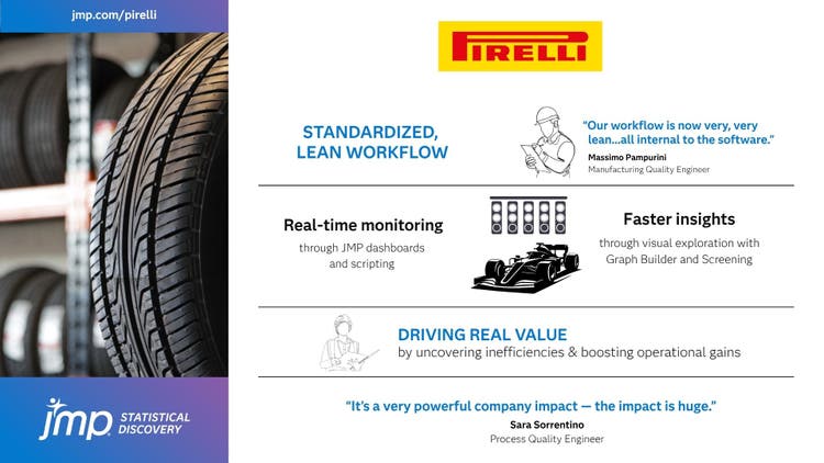 “We had heard many times about the power of big data analytics, but we needed the right tools to implement analytics successfully,” Sorrentino explains. That’s why Pirelli ultimately landed on JMP statistical discovery software as its standard tool for the analytics workflow.