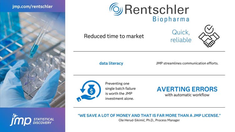 Biopharmaceutical CDMO Rentschler Biopharma SE sees digital transformation as key to accelerating critical therapeutic advancements. The organization’s widespread culture of data literacy has proven to be essential in translating the promise of digitalization into real improvement: faster timeframes, better reliability, more process robustness. In this video, Rentschler Biopharma Process Manager Ole Herud-Sikimić, PhD, explains that the automatization of data workflows in JMP has deepened collaboration and helped build rich scientific and process knowledge.