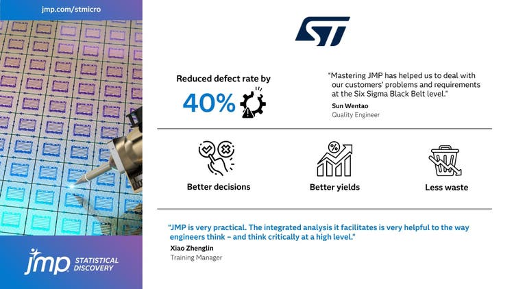 "Companies can make [improvement and optimization] projects more efficient when they develop data analytics talent,” he says. “That’s why the introduction of JMP® across STMicroelectronics has been a very powerful complement to our talent development.”