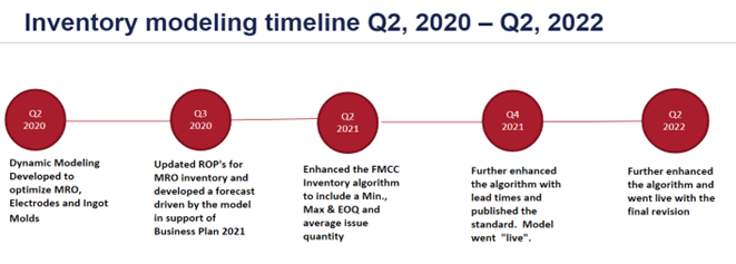 Now, with the click of a button, the system accesses, and queries data from Metallus’ database, runs an optimization algorithm for each item based on historical consumption and current lead time calculations, and produces a set of recommendations: when items should be reordered and in what quantity. When the balance of any one inventory item drops below a certain threshold, the system will trigger a buy. Thresholds are set so as to account for global supply chain events, including longer than average lead times.