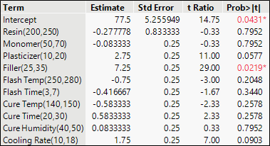 With 10 factors and a model that contains only the main effects, a 12-run design has just enough runs to obtain an estimate of the experimental error, so you can get p-values to assess the statistical significance of the effects. The estimates for each of the main effects, along with their corresponding test statistics and p-values (denoted Prob>|t|), are shown below. Recall that each of the main effects are partially confounded with multiple two-factor interactions. If you conclude that a main effect is significant, you’re assuming that the impacts of those confounded interactions are negligible.
