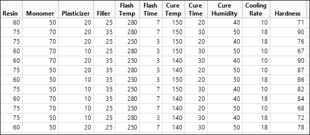 Let’s imagine that an engineering team for a manufacturer of polymer materials wants to run an experiment to identify the factors that could influence the hardness of a new material formulation. Ten candidate factors are chosen with the factors to be studied at two levels.