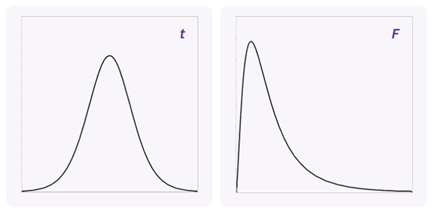 Common reference distributions in hypothesis testing are the t distribution and the F distribution. Examples of these distributions are shown below.