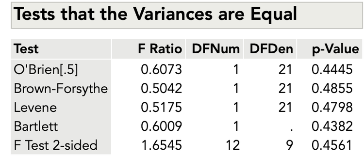 Like most statistical software, JMP shows the p-value for a test. This is the likelihood of finding a more extreme value for the test statistic than the one observed. It’s difficult to calculate by hand. For the figure above, with the F test statistic of 1.654, the p-value is 0.4561. This is larger than our α value: 0.4561 > 0.10. We fail to reject the hypothesis of equal variances. In practical terms, we can go ahead with the two-sample t-test with the assumption of equal variances for the two groups.