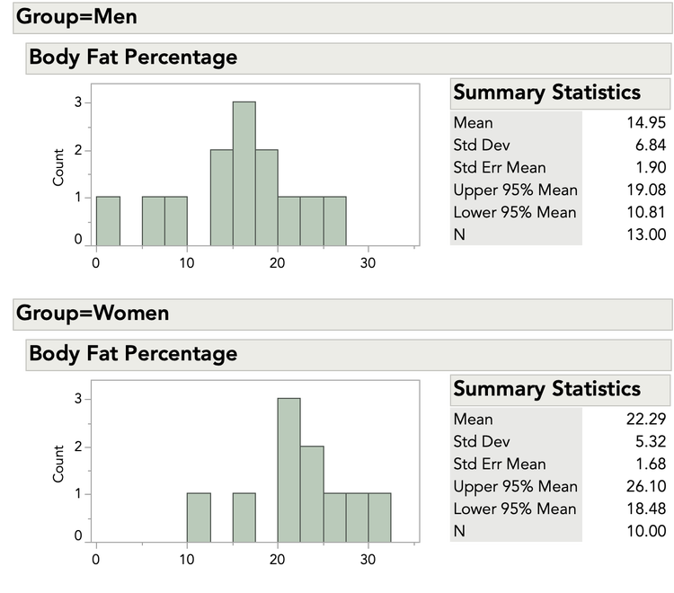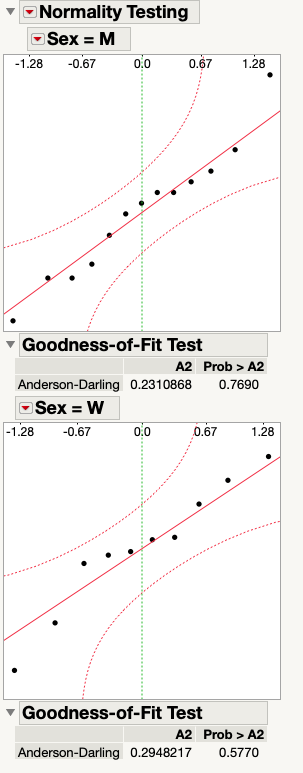 You can also perform a formal test for normality using software. The figure above shows results of testing for normality with JMP software. We test each group separately. Both the test for men and the test for women show that we cannot reject the hypothesis of a normal distribution. We can go ahead with the assumption that the body fat data for men and for women are normally distributed.