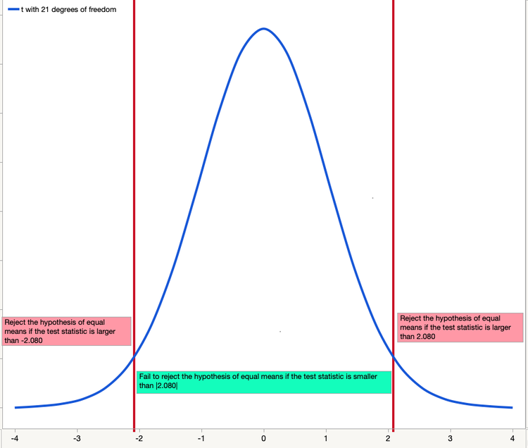 Using a visual, you can check to see if your test statistic is a more extreme value in the distribution. The figure below shows a t-distribution with 21 degrees of freedom.