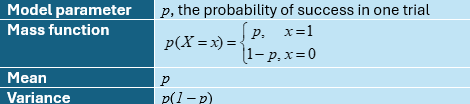 The Bernoulli distribution is used to model the results of a Bernoulli trial. The trials must be independent and the probability, p, of the outcome of interest in each trial must remain constant. How might you estimate this probability? Let’s call the outcome of interest Success. You might collect data from multiple trials and use the ratio of the number of successes to the number of trials as an estimate of the probability of Success in any one trial. Or you might model the probability of Success as a function of independent variables. This model is often a logistic regression model