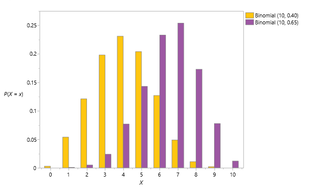 The graph below shows a binomial distribution when n = 10 for p = 0.40 and p = 0.65.