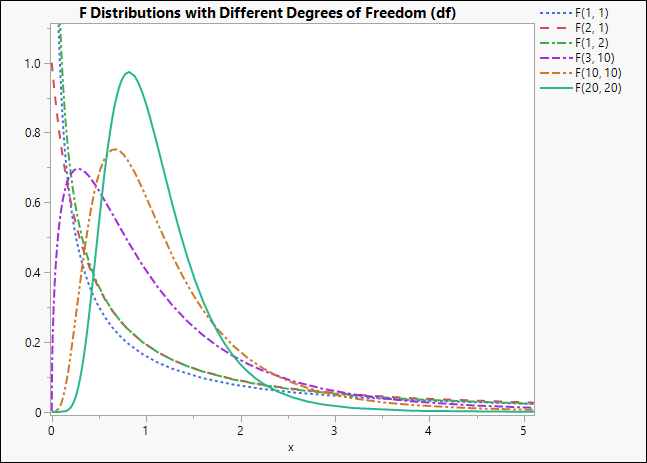 Several F distributions with different degrees of freedom are shown in the graph below.