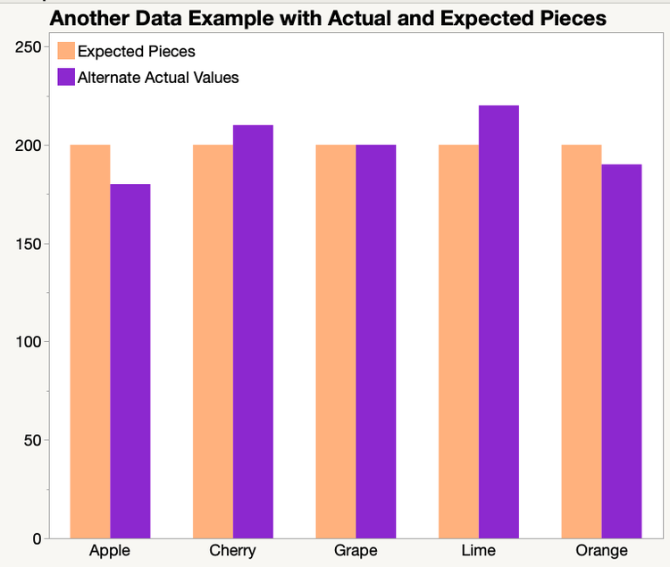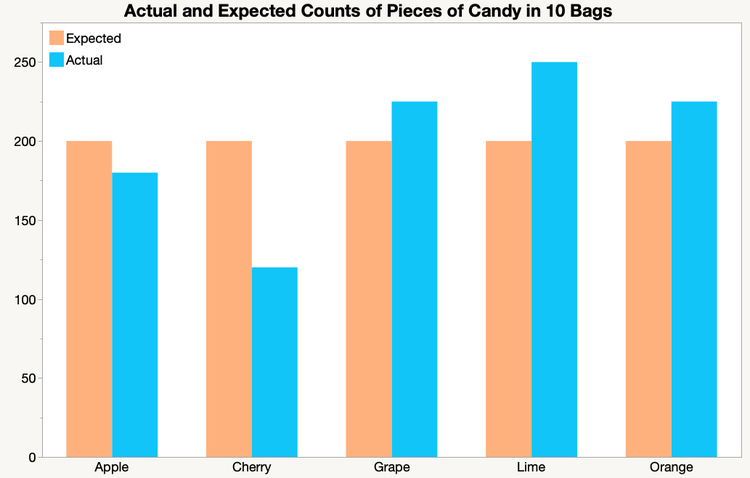 Without doing any statistics, we can see that the number of pieces for each flavor are not the same. Some flavors have fewer than the expected 200 pieces and some have more. But how different are the proportions of flavors? Are the number of pieces “close enough” for us to conclude that across many bags there are the same number of pieces for each flavor? Or are the number of pieces too different for us to draw this conclusion? Another way to phrase this is, do our data values give a “good enough” fit to the idea of equal numbers of pieces of candy for each flavor or not?