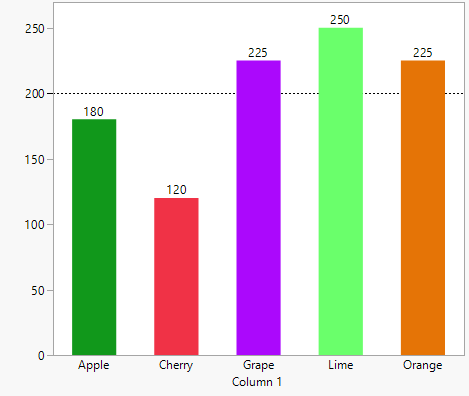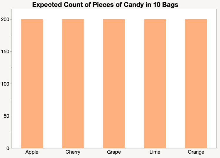 Another simple bar chart shows the expected counts of 200 per flavor. This is what our chart would look like if the bags of candy had an equal number of pieces of each flavor.
