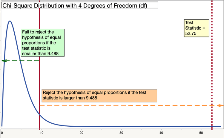 The Chi-square value with α = 0.05 and 4 degrees of freedom is 9.488. - We compare the value of our test statistic (52.75) to the Chi-square value. Since 52.75 > 9.488, we reject the null hypothesis that the proportions of flavors of candy are equal.