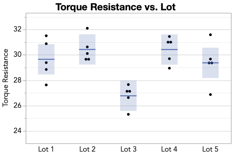 From the plot of the data, you observe that torque measurements from the Lot 3 jars tend to be lower than the torque measurements from the samples taken from the other lots. When you calculate the means from all your measurements, you see that the mean torque for Lot 3 is 26.77—much lower than the other four lots, each with a mean of around 30.