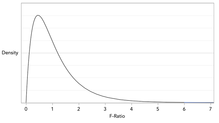 The ratio of MS(factor) to MS(error)—the F ratio—has an F distribution. The F distribution is the distribution of F values that we'd expect to observe when the null hypothesis is true (i.e. the means are equal). F distributions have different shapes based on two parameters, called the numerator and denominator degrees of freedom. For an ANOVA test, the numerator is the MS(factor), so the degrees of freedom are those associated with the MS(factor). The denominator is the MS(error), so the denominator degrees of freedom are those associated with the MS(error).