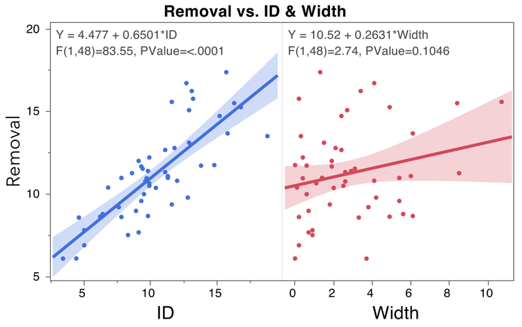 Continuing with this example, we learn that there is a significant relationship between Removal and ID, and that for a 1-unit increase in ID, Removal increases by 0.65 units on average. We also learn that there is not a significant relationship between Removal and Width. In other words, there is no association between changes in Width and changes in Removal.