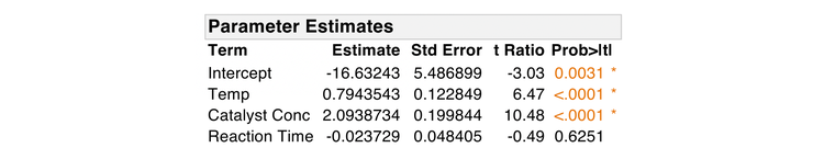 Returning to our example, both Temp and Catalyst Conc are highly significant. But Reaction Time is not significant, given the other terms in the model. The coefficients for Temp and Catalyst Conc are both positive, indicating that as the values of each of these variables increase, holding everything else constant, Impurity also increases.
