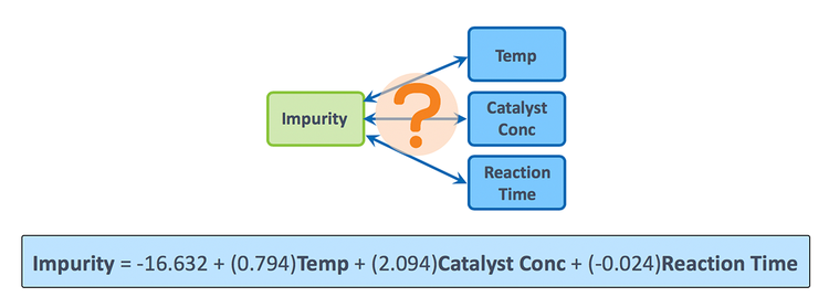 We use regression to understand the relationship between Impurity and three predictors, Temp, Catalyst Conc, and Reaction Time. The estimated, or fitted, regression equation is shown here.