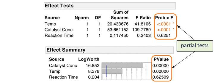 This is what is known as a whole model test. The ANOVA table enables us to make decisions about the significance of our model on the whole, but it doesn’t tell us which predictors are significant. For this, we use the information reported in the Effects Test table. This information is also reported in the Effect Summary table.