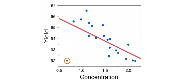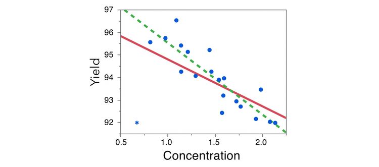 But some outliers or high leverage observations exert influence on the fitted regression model, biasing our model estimates. Take, for example, a simple scenario with one severe outlier. This observation has a much lower Yield value than we would expect, given the other values and Concentration.
