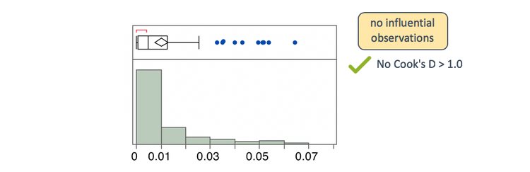 Returning to our Impurity example, none of the Cook’s D values are greater than 1.0. So, we can conclude that no one observation is overly influential on the model.