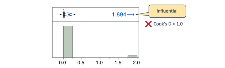 There is one Cook’s D value for each observation used to fit the model. The higher the Cook’s D value, the greater the influence. Generally accepted rules of thumb are that Cook’s D values above 1.0 indicate influential values, and any values that stick out from the rest might also be influential. For our simple Yield versus Concentration example, the Cook’s D value for the outlier is 1.894, confirming that the observation is, indeed, influential.