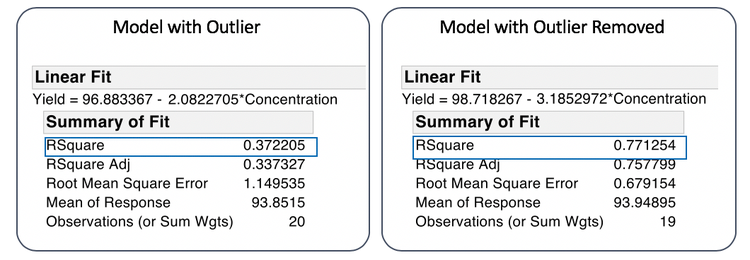 Note the change in the slope of the line. The slope is now steeper. An increase in the value of Concentration now results in a larger decrease in Yield. Also, note the change in the fit statistics. RSquare increased from 0.337 to 0.757, and Root Mean Square Error improved, changing from 1.15 to 0.68. Much more of the variation in Yield is explained by Concentration, and as a result, model predictions will be more precise.