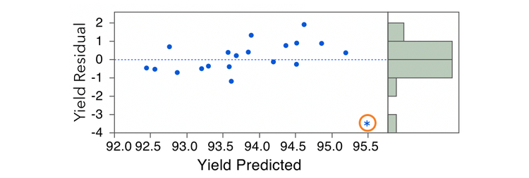 The regression model for Yield as a function of Concentration is significant, but note that the line of fit appears to be tilted towards the outlier. We can see the effect of this outlier in the residual by predicted plot. The center line of zero does not appear to pass through the points.