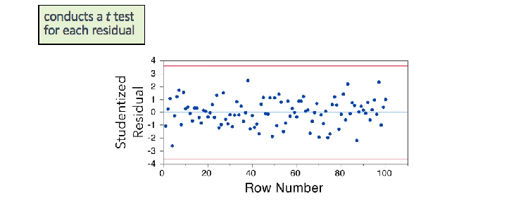 Studentized residuals are more effective in detecting outliers and in assessing the equal variance assumption. The Studentized Residual by Row Number plot essentially conducts a t test for each residual. Studentized residuals falling outside the red limits are potential outliers.