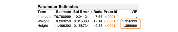 For a given predictor variable, a regression model is fit using that variable as the response and all the other variables as predictors. The RSquare for this model is calculated, and the VIF is computed. This is repeated for all predictors. The smallest possible value of VIF is 1.0, indicating a complete absence of multicollinearity. Statisticians use the term orthogonal to refer to variables that are completely uncorrelated with one another.