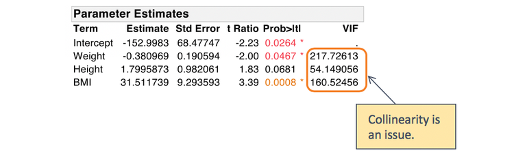 A VIF for a predictor of 10.0 corresponds to an RSquare value of 0.90. Likewise, a VIF of 100 corresponds to an RSquare of 0.99. This would mean that the other predictors explain 99% of the variation in the given predictor. In most cases, there will be some amount of multicollinearity. As a rule of thumb, a VIF of 5 or 10 indicates that the multicollinearity might be problematic. In our example, the VIFs are all very high, indicating that multicollinearity is indeed an issue.