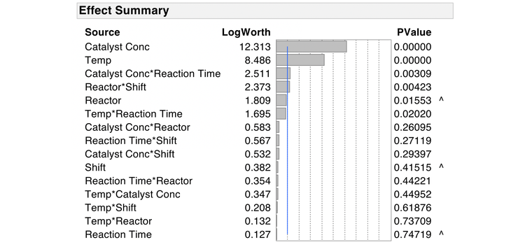 We remove this term and see that all the statistical output has updated, including the fit statistics and p-values for the model terms. The next candidate for removal is Temp*Catalyst Conc.