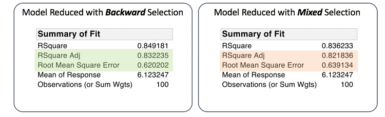 The mixed approach addresses a fundamental drawback of forward selection: terms might become insignificant after other terms have been added to the model. Mixed selection allows nonsignificant terms to be removed. In this example, mixed selection results in a smaller model than backward selection. But, if we compare these two models, RSquare Adjusted is lower and Root Mean Square Error is higher for the mixed model. So, the backward selection model outperforms the mixed selection model.