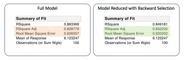 Let’s compare the fit of the full model against this new reduced model. Both RSquare Adjusted and Root Mean Square Error are improved over the full model. So, this reduced model is better.