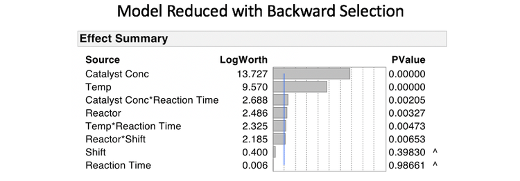 Let’s look at an example. For the Impurity data, we fit a full model with two-way interactions. Reaction Time has the highest p-value. However, the caret next to the p-value indicates that Reaction Time is involved in interactions in the model, so we leave it in the model. The next highest p-value is Temp*Reactor.