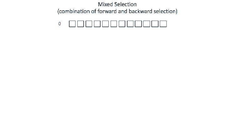 A third classic variable selection approach is mixed selection. This is a combination of forward selection (for adding significant terms) and backward selection (for removing nonsignificant terms). As in forward selection, we start with only the intercept and add the most significant term to the model. We continue to add the most significant variables, one at a time. We again use a p-value threshold to determine when to stop adding terms to the model. For example, we might set the p-value to enter the model at 0.05 or 0.10. At each step, we look at the p-values for the terms in the model and compare the p-values to the threshold for removal. If a p-value is greater than the threshold, the term is removed from the model.