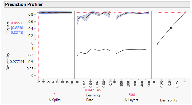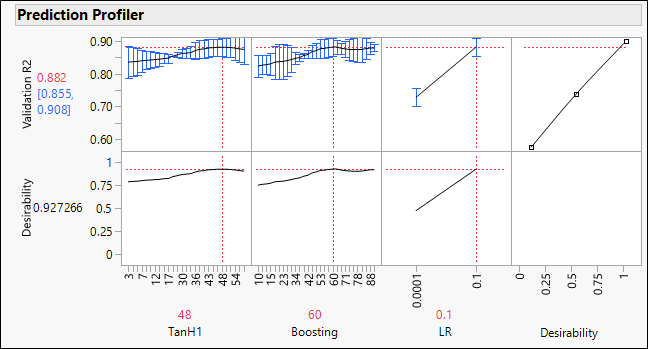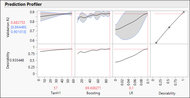 You’ll notice that the best run has a validation R-square of 0.879. We can fit a model to these data using Validation R2 as a response then use the model to determine the best settings of the boosted neural hyperparameters.