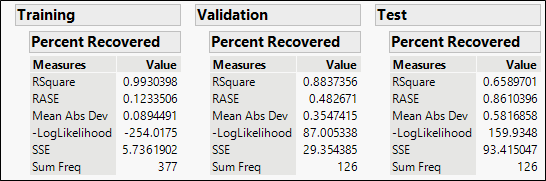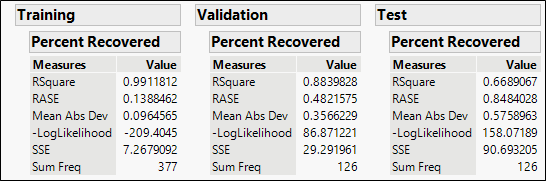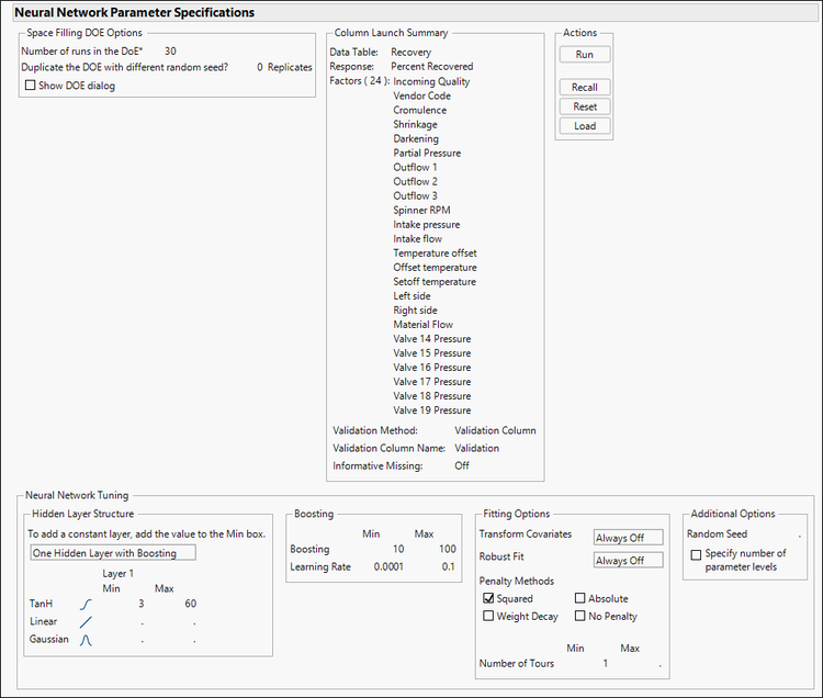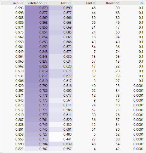 Let’s create a tuning table for a boosted neural model using the Percent Recovered response in the Recovery data. In this simple example, we’ll vary the number of TanH nodes, number of models in boosting, and the boosting learning rate. We make 30 runs.