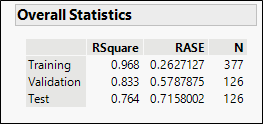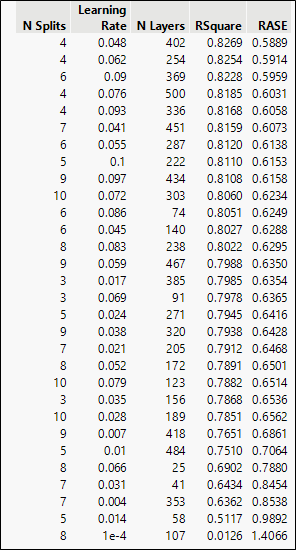 The R-Square and RASE on the validation data are displayed. The best fit model has four splits per tree, a learning rate of 0.048, and 402 layers. R-Square on the validation set is 0.827. This run gives the best performance according to R-Square.