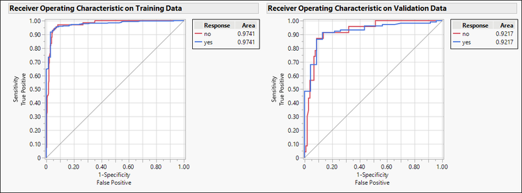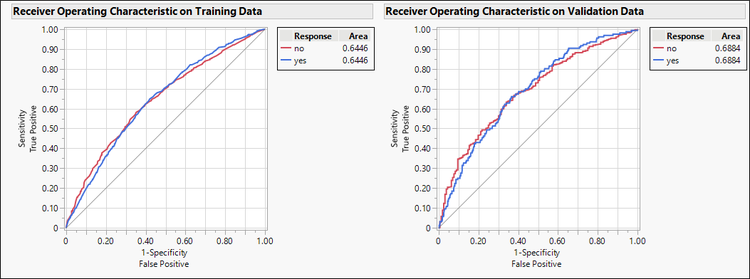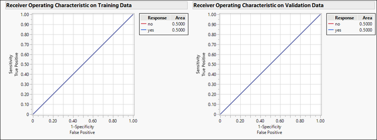 If the model classifies no better than flipping a coin, the ROC curve looks like a 45-degree line. The more the ROC curve arches up from the 45-degree line, the more accurately the model predicts compared to the random model.