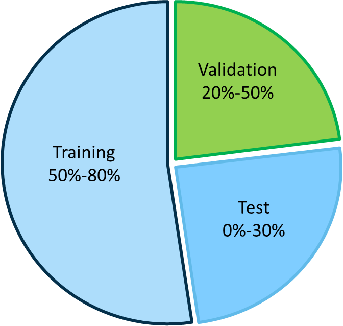 Holdout validation, also called stopped training or holdback validation, uses 50-80% of the data for training (model fitting), 20-50% of the data for validation (model comparison), and 0-30% of the data for testing (assessing model performance).