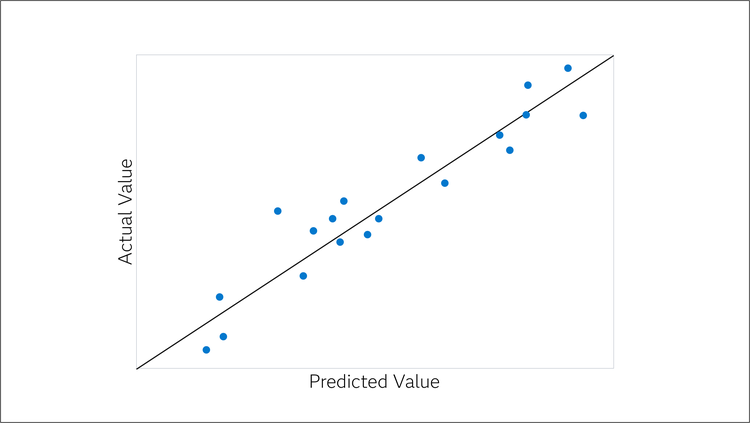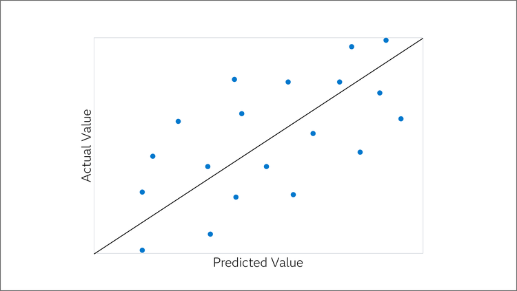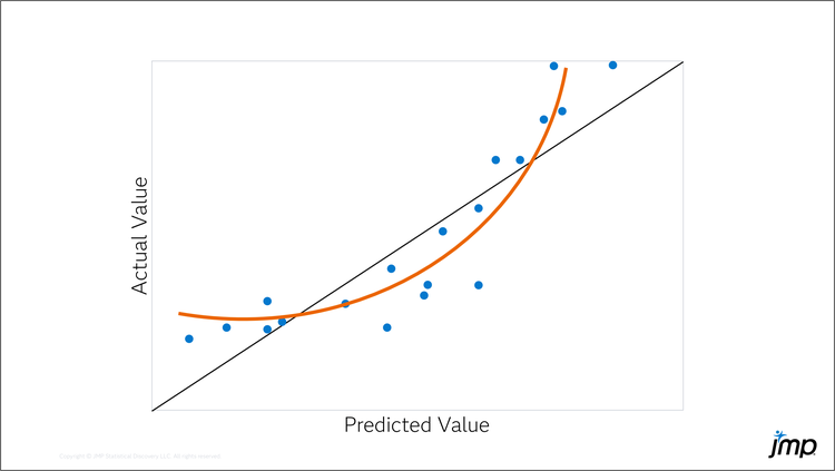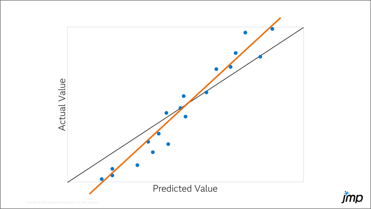 For a continuous response, the actual by predicted plot shows the bias and variance of the model fit. A perfect model has points on the line y = x. Deviations from the perfect model occur because of model bias and model variance as shown in the figures below. The black line represents y = x; the orange line shows the trend of model bias.
