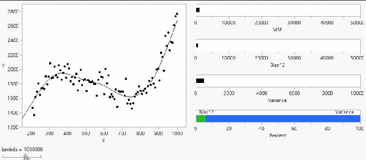 Consider the data in the figure below. You’ll notice that there is one response variable and one predictor variable. A model that is too simple, like the straight line, yields biased predictions. There are areas of the predictor space that give the wrong predictions on average. A model that is too complex and does not generate good predictions is often referred to as overfitting. Simply put, underfit models gives predictions with high bias; overfit models give predictions with high variance. Finding the right balance of model complexity is critical to obtaining a good predictive model.